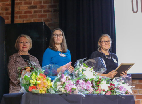 Riikka Vacker, Mari Pastila-Eklund ja Anna Mari Leinonen valmiina onnittelemaan oppisopimuskilpailussa palkittuja keskiviikkoiltapäivänä